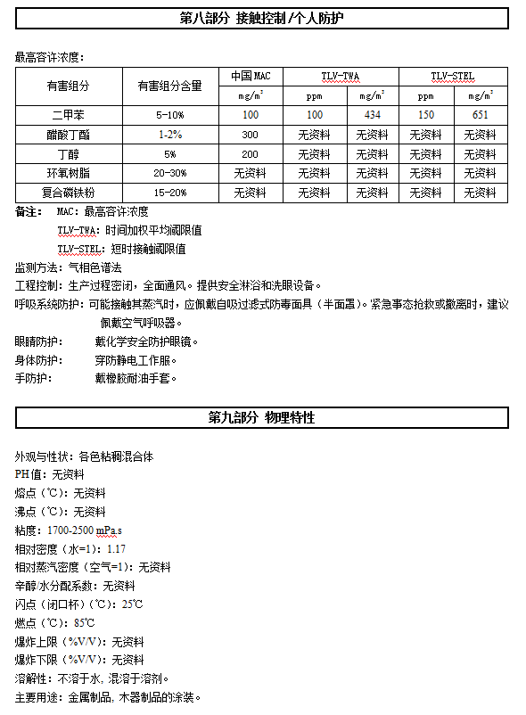 警告:会引起眼睛和皮肤的刺激。反应的蒸汽可能会引起过敏人群的呼吸道刺激。可能会引起皮肤过敏反应。避免呼吸蒸汽。请勿触及眼睛、皮肤。要使用眼、耳、皮肤的防护用具,使用合适的面具,以避免潜在的呼吸道刺激。使用后用清水彻底的清洗皮肤。如有不适请咨询医生。衣物再次使用前要洗涤。如果没有呼吸要进行人工呼吸,最好嘴对嘴,并请医生处理。灼伤:放热反应会使产品变热,超出正常水平。在混合后要小心处理。使用手套。急救:如果不慎接触了眼睛,立即用清水冲洗至少 15 分钟,并脱去污染的衣鞋,用肥皂清洗接触后的皮肤。