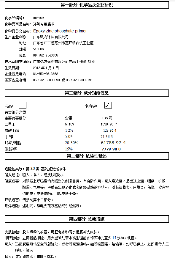 产品总述 HD-159 是一种含磷酸锌防锈颜料的双组份环氧底漆,漆膜坚韧,高效防锈。