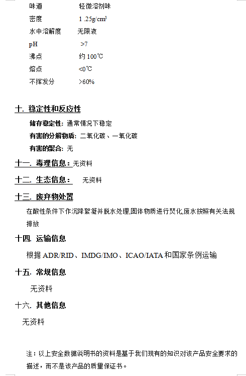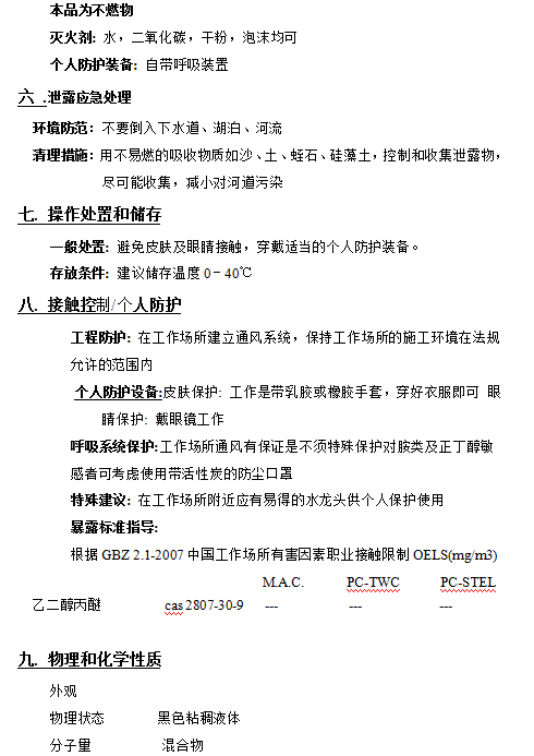 水平。在混合后要小心处理。使用手套。急救:如果不慎接触了眼睛,立即用清水冲洗至少 15 分钟,并脱去污染的衣鞋,用肥皂清洗接