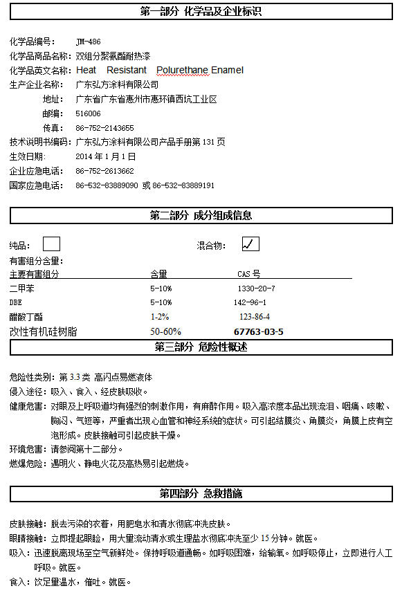 产品总述 JM-486是双组份改性有机硅漆,主漆由聚酯改性有机硅树脂和耐热颜料、助剂等组成,