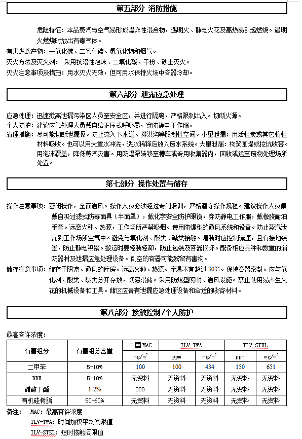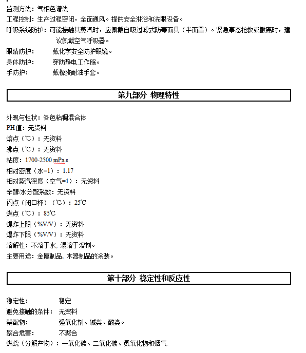会引起眼睛和皮肤的刺激。反应的蒸汽可能会引起过敏人群的呼吸道刺激。可能会引起皮肤过敏反应。避免呼吸蒸汽。请勿触及眼睛、皮肤。要使用眼、耳、皮肤的防护用具,使用合适的面具,以避免潜在的呼吸道刺激。使用后用清水彻底的清洗皮肤。如有不适请咨询医生。衣物再次使用前要洗涤。如果没有呼吸要进行人工呼吸,最好嘴对嘴,并请医生处理。灼伤:放热反应会使产品变热,超出正常水平。在混合后要小心处理。使用手套。急救:如果不慎接触了眼睛,立即用清水冲洗至少 15 分钟,并脱去污染的衣鞋,用肥皂清洗接触后的皮肤。