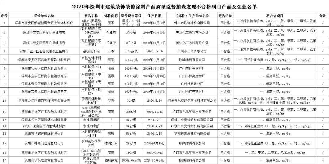 3月10日,深圳市市场监督管理局发布《关于2020年建筑装饰装修用涂料产品质量监督抽查结果通报》。通报指出,深圳市市场监督管理局组织开展了建筑装饰装修用涂料产品质量监督抽查, 检验发现不合格样品17批次,不合格产品发现率为8.1%。